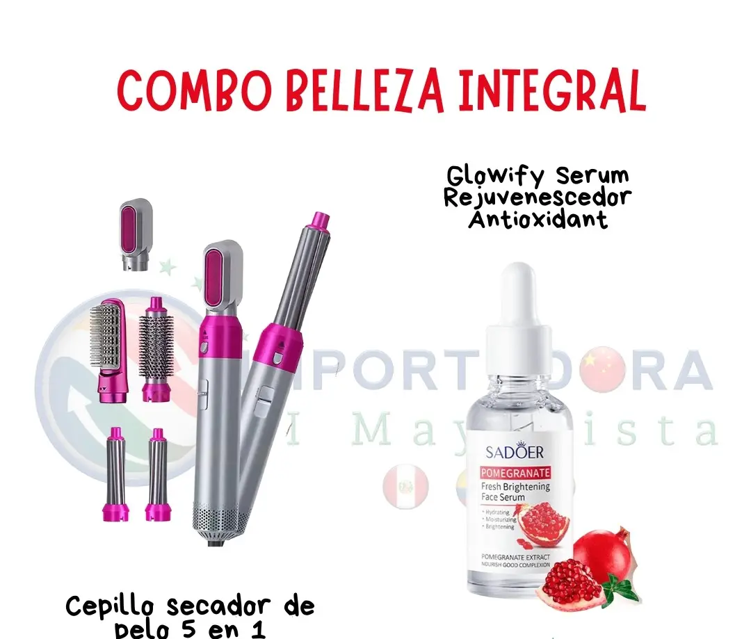 Este combo no solo te ofrece dos productos excelentes, sino una solución completa: mientras tu Glowify Serum trabaja para rejuvenecer e iluminar tu rostro por la noche, tu Cepillo 5 en 1 te garantiza un peinado impecable por la mañana.