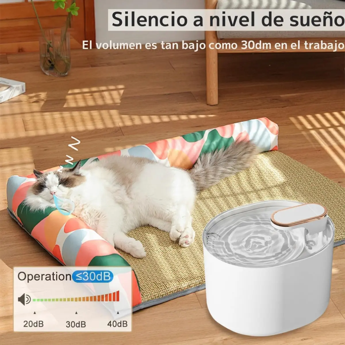 Estaba preocupado por el ruido, pero es increíblemente silenciosa. Apenas se escucha un murmullo del agua, nada que moleste por la noche. Mi mascota se acercó a beber inmediatamente. La calidad de los materiales se siente duradera. Completamente recomendada.