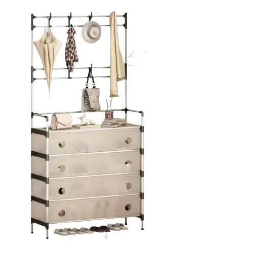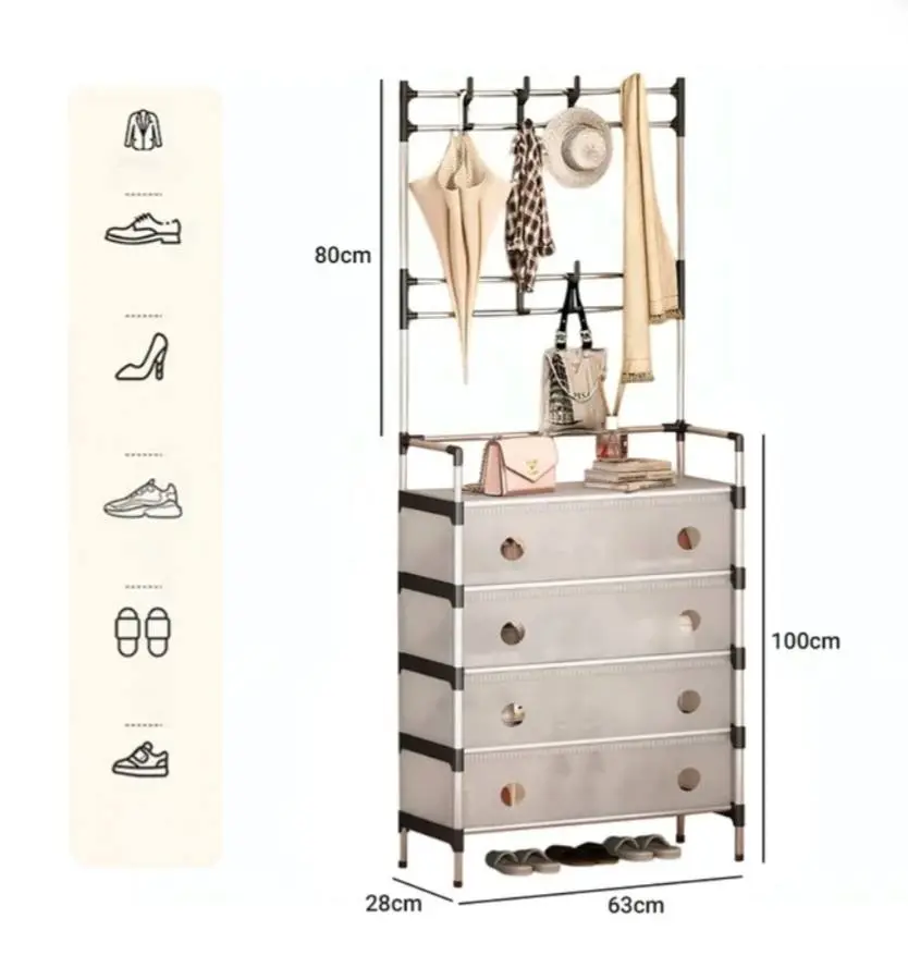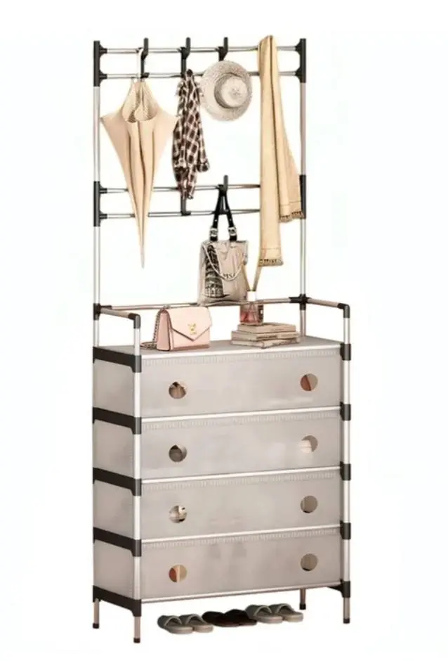 Parte Superior (Perchero y Estantería): Cuenta con barras horizontales que sirven como percheros para colgar abrigos, bufandas, sombreros o ropa recién planchada. La barra superior más alta también se utiliza para colgar artículos más largos, y suele incluir ganchos laterales o frontales para bolsos y accesorios. La superficie plana justo encima de los cajones puede servir como un estante para colocar objetos decorativos, libros, perfumes o un cuenco para llaves.